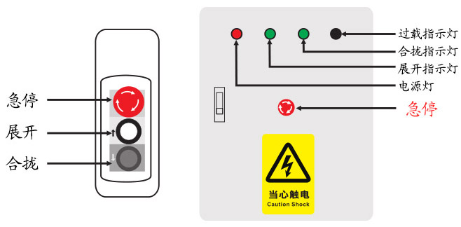 注:手柄開關(guān)使用方法為點(diǎn)動(dòng)。長按合攏按鈕即可合攏,當(dāng)看臺(tái)徹底合攏時(shí),觸碰到限位開關(guān)會(huì)自動(dòng)停止。